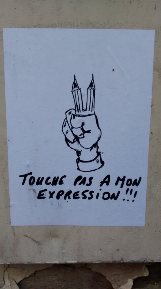 Mostly yes. Many pieces are tightly bound to a specific context, either political or cultural. When the context changes, so does the meaning and function of the Street Art piece. Most people still remember the terrorist attack in Charlie hebdo’s editorial office in Paris, on January 2015 the 7th, about ten years after the French satirical newspaper decided, in the name of freedom of the press, to publish some controversial caricatures of Mahomet that had been published three months before in the Danish Jyllands-Posten. Therefore, even today, most people can still relate the artworks produced to their original context of the aftermath of the bloody attack. However, the ability for future generations to understand all the visual and textual references seems quite unlikely. In the following example (fig. 1), the drawing of two V-shaped pen-fingers relates to the draughtsmen targeted by the killers and the conviction that freedom of speech will win despite opposite attempts to gag it. The writing relates to two references: one is the slogan «Touche pas à mon pote» (don’t touch my pal), SOS Racisme’s motto, meaning solidarity with immigrants and fight against racism; the other one is the «liberté d’expression», one of the fundamental human rights expressed in the 1789 Déclaration des Droits de l’Homme et du Citoyen (although the literal expression was officially born in the Article 10 of the 1950 European Convention on Human Rights).