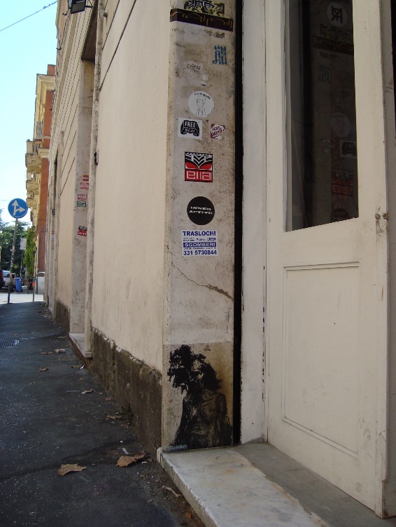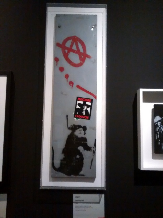 Second, taking a picture of a Street Art work or removing it from the public space to make it transportable and perhaps marketable, even virtually, implies choosing a point of view from which the piece is supposed to be seen, denying by default all others. It also implies a framing: but where does a Street Art work end? As a site-specific artwork, a Street Art work certainly does not end with the limits of its edges. A sticker has clear edges, so do paste-ups or stencils, especially when they are reproduced in number and spread over the city with apparently no care for the location. But what if these pieces are in situ and their context contribute to their meaning? The curators of the exhibition Street Art Banksy & co. L’arte allo stato urbano in Bologna (Italy) in 2016 had to tackle this insoluble issue for the pieces removed from their original public location and labelled as «street piece[s]». The «solution» they came up with varied: sometimes they included part of the original environment as it was–or was supposed to be–when the work was removed, sometimes they didn’t. Banksy’s stencil titled Anarchy rat (fig. 11) shows the stencil of a rat and, upon it, two other productions very likely not to be Banksy’s: a circled A written with a red marker pen, symbol of anarchists, and a sticker representing the figure of Moore and Lloyd’s Vendetta and the words «Regime Change». Another Banksy’s «street piece», though, the Radar rat (fig. 10), includes nothing but the stencil.