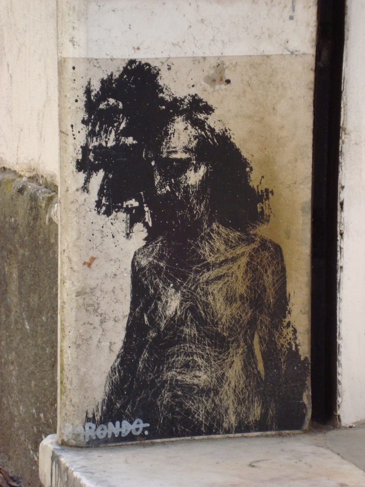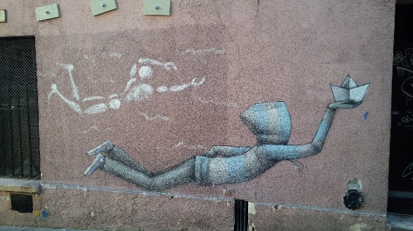 Finally, what is the matter of Street Art? Ernest Pignon-Ernest is often said that the drawing is one third of the piece of art, because his works are «des oeuvres de situation» more than «des oeuvres en situation»2 –works of the site/situation more than works in the site/situation3. The wall, the medium, the environment itself with its social characteristics, the location with its memories and narratives, and even the reception by the viewers are the main parts of the piece. Street Art is not Internet Art, neither a photographic art, nor any kind of a framable piece of art. It is an ephemeral art whose proper matter and material (painting, wall, bench…) is nothing but a singled-out part. Genetically intended to interact with passersby, therefore sentenced to change fast and disappear, its lifespan is uncertain, and after its material disappearance its memory survives through representations, either material (photos, books) or immaterial (words, narratives, emotions). As Teresa Lousa puts it, «the anonimity, ephemeral, and transitory element» is a «key feature of [Street Art’s] artistic creation» (Lousa, 2015). It is a key feature of the viewer’s experience too. A Street Art work is a process rather than a piece, it is part of the real life of a given neighbourhood. Encountering a Street Art work is receiving an unexpected gift, which is unique at that given time, in that given area, in that random moment of one’s life. Its power comes from intruding on your daily life, but it is also due to its being alive and promised to death.
