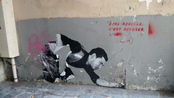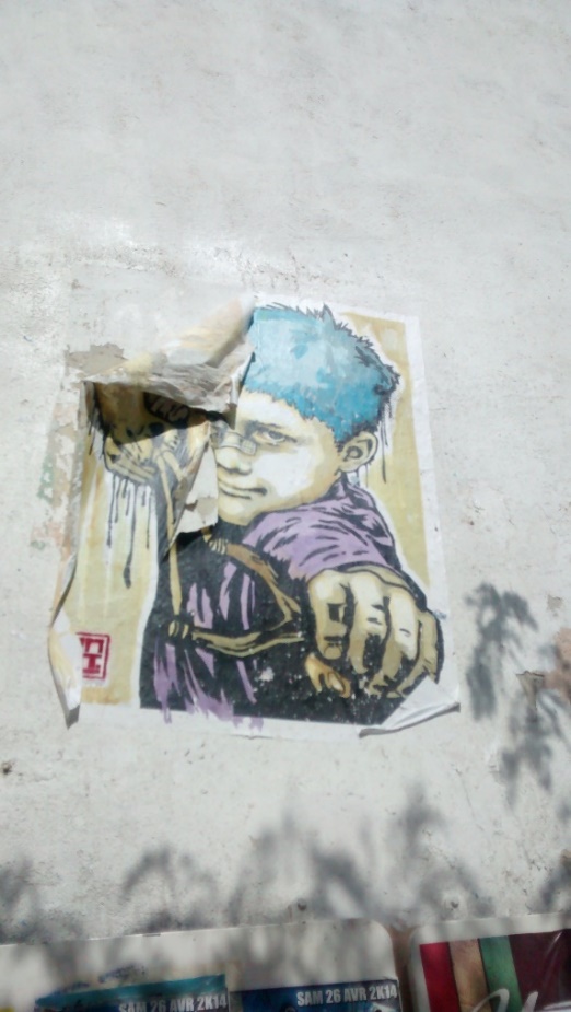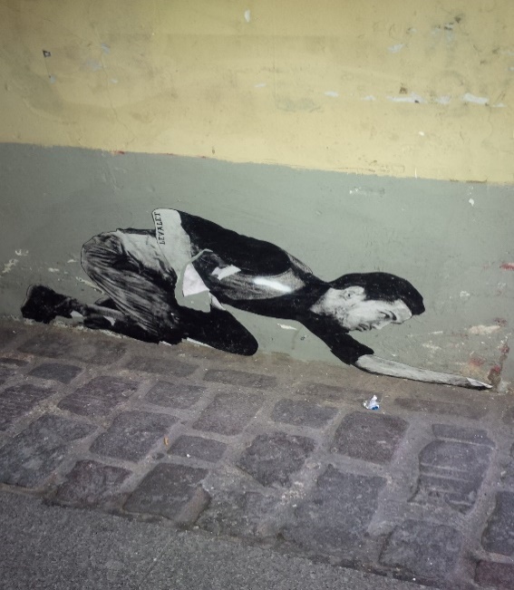 According to the opposite point of view, Street Art is a specific type or genre of art. The various criteria to define it are not necessarily seen as a collective requirement even though they are not individually relevant: the pieces are situated in the public space; they are often site-specific (i.e. designed for a specific location that gives them their meaning, at least partly), as in Les expulsés (1977-1978) by Ernest Pignon-Ernest, for instance, where the location on a wall of a demolished building tells the story of the two figures drawn on the piece: that of being evicted from their flat for political decision. In this context, they are also self-authorized (Blanché, 2015), executed for free, and intended to a wide audience, unlike Graffiti. Street Art includes a great variety of media (walls, furniture, doors, sidewalks…), tools and techniques (spray paint, stencil, sticker, carving, yarn bombing, adhesive tape…), and intentions. It often carries out a political claim but, unlike what we could call street creativity or street communication (for instance graffiti, political statements or private advertisements), Street Art also meets artistic requirements for it is ambiguous, poetic and/or playful. Of course, art is in the eyes of the beholder and it is impossible to decide where art starts or ends, particularly since Marcel Duchamp’s art revolution. This is why the border between Street Art and Street Creativity is always questionable, and this is why still today, after some years of academic research on a not so young phenomenon anymore, there is no consensus about what Street Art is or is not: « term Street Art cannot be defined conclusively since what it encompasses is constantly being negotiated » (Bengtsen, 2014).