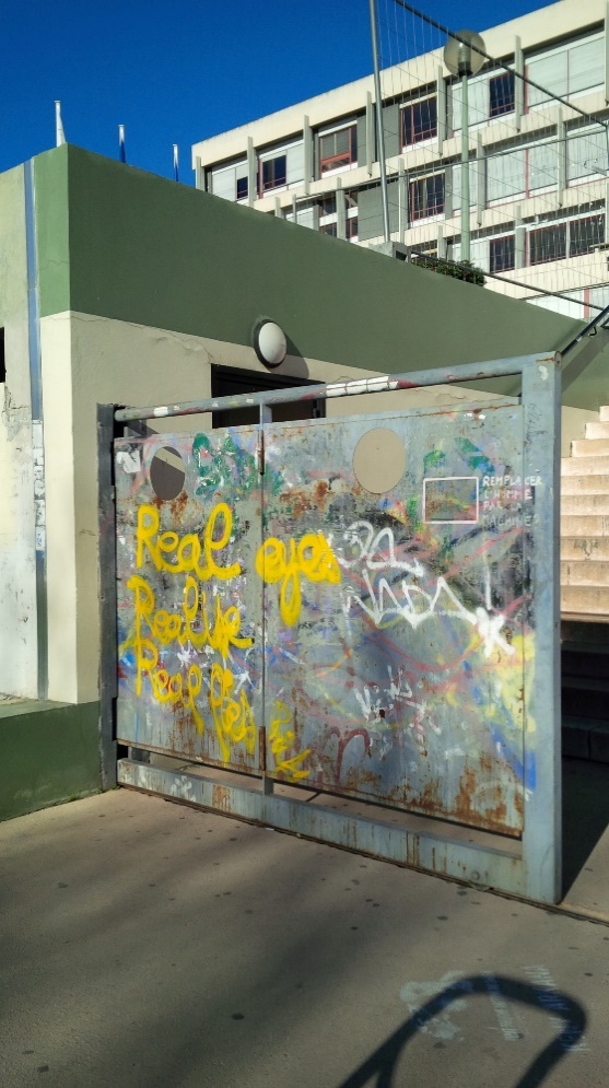 1) Graffiti (or Writing, Graffiti Writing, Style Writing Graffiti), whose specificities are –including but not limited to–: the artist’s signature as main part of the piece, the execution on various media (walls, trains, all kinds of street furniture), the location in the public space, usually in derelict sites of the cities and outskirts or in transit zones (like stairs or tunnels), the absence of formal authorization, the style of the writing (unlike graffiti made without aesthetic purpose), the encryption of letters, providing tribal nature to the communication, therefore, the limited audience (writers themselves);