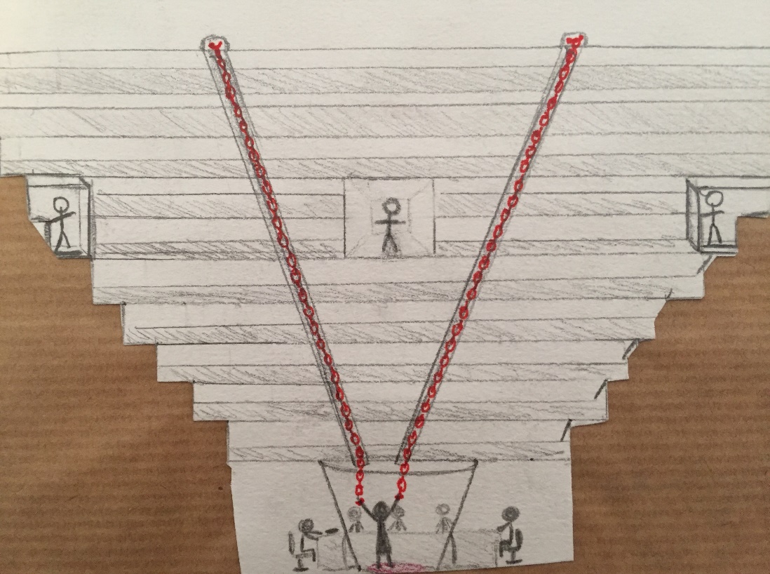 Trois praticables rectangulaires transparents sortiraient à mi-hauteur de l’arène, dans lesquels se succéderaient les autres personnages selon les tableaux. Ces cages de verre s’avanceraient vers le centre de l’arène progressivement et seraient équipées chacune d’un tapis ou plutôt d’une bande roulant sur toute la longueur. La circularité du public est un leurre. En effet, une partie le composant est en réalité constituée de figurants, qui quittent leur place et créent un vide afin de figurer l’absence des pères, des fils et des soldats…