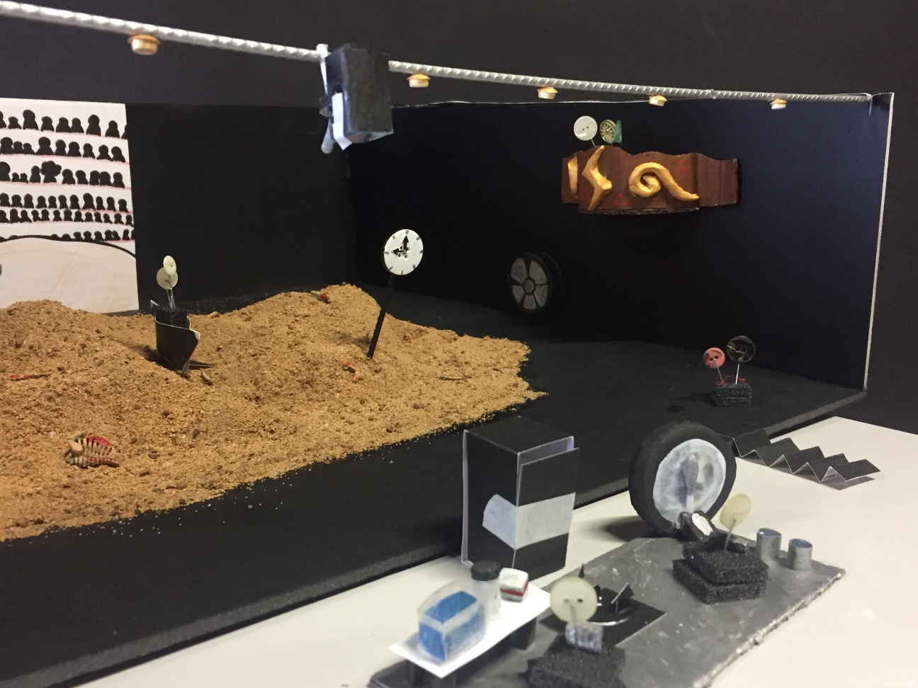 Les dunes sont l’élément central de ma scénographie, car elles ajoutent des contraintes physiques aux comédiens. L’horloge, en avant-scène, est plantée dans le sable. Les balcons, de part et d’autre de la scène, sont occupés, l’un, par les dieux, l’autre, par l’équipe technique et l’équipe de création. Ils rappellent les balcons des théâtres à l’italienne. L’idée est aussi d’y mettre les dieux spectateurs du sort des hommes comme dans La Bonne Âme du Se-Tchouan de Brecht. Les dieux voient tout depuis les balcons mais ne descendent jamais pour rejoindre l’action. Devant la scène est installé un espace à la vue du public, où deux régisseurs créent en direct du son et de l’image. La vidéo est utilisée pour répondre à des problèmes de représentation : par exemple, l’église en flamme mentionnée dans le texte est une église miniature à laquelle le régisseur met le feu. L’incendie est alors projeté en vidéo sur la totalité du fond de scène. Ce dispositif s’inspire de celui du théâtre d’objets de Romain Bremond et de Jean-Baptiste Maillet (Compagnie Stéréoptik). Au septième tableau, une toile de fond tombe : il s’agit du tableau de Botticelli représentant l’enfer d’après la description que Dante en fait dans la Divine Comédie. À la fin de la pièce, un miroir est tendu au public, reflétant le théâtre, suggérant que « l’enfer, c’est les autres » selon l’idée de Sartre. Mais l’enfer peut aussi être soi-même.