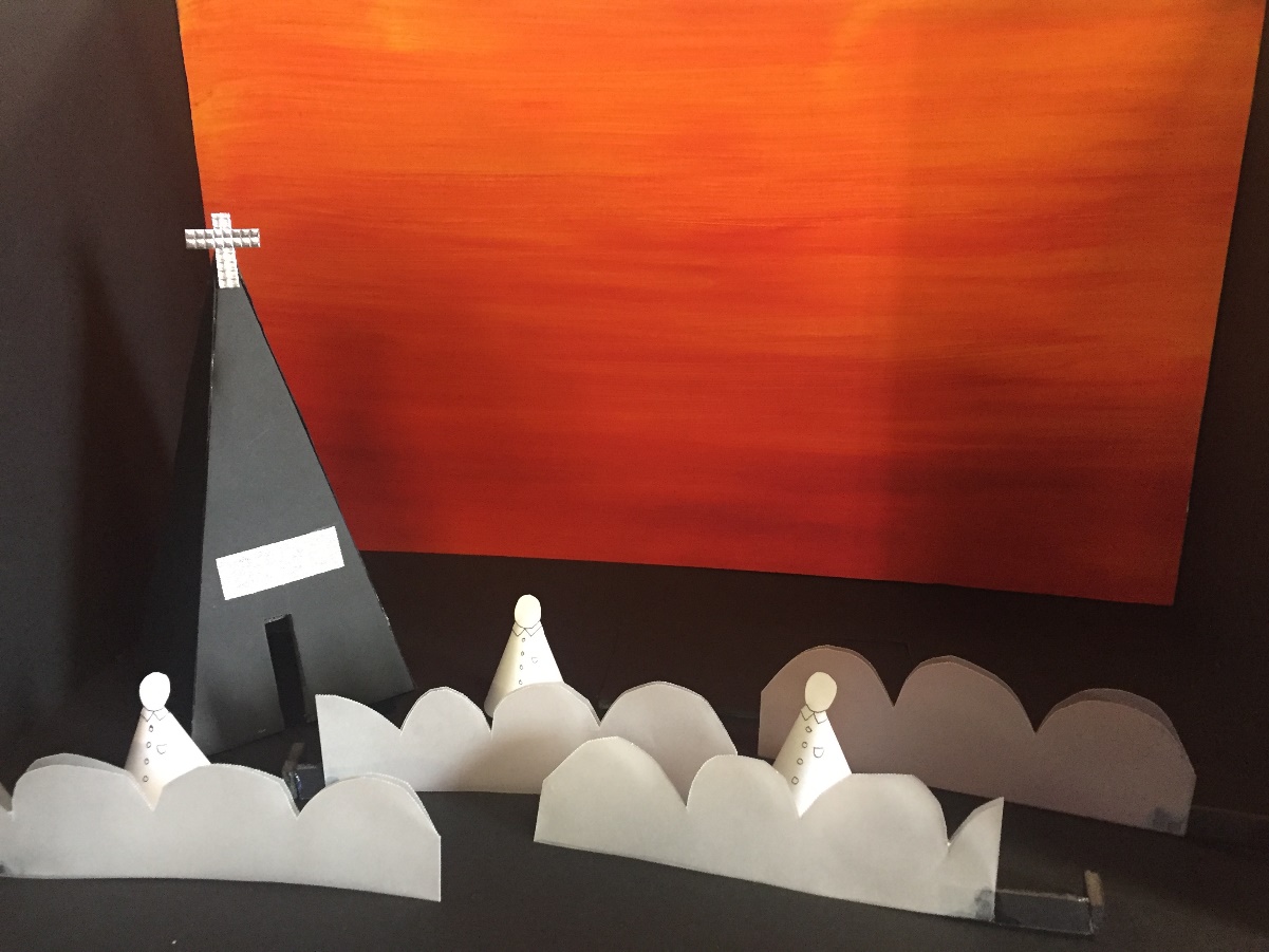 Premier tableau. Noir sur la scène. Seulement des bruits de « doux clapotis et de brefs glouglous acérés »17 (ChS, p. 7). Un cyclorama de couleur orange pour représenter « l’aurore aux doigts de rose »18. Le sable est figuré par des fumées artificielles. Des comédiens entrent sur scène vêtus de longues chemises blanches, comme des âmes errantes. L’église incendiée surgit du sol. Perséphone apparaît au milieu de l’écran suspendu. Pendant son récit, l’écran descend sur scène. Flot continu de sons. Une silhouette est restée, le poignet attaché au fil rouge de Perséphone. Noir sur la scène. Cacophonie de bruits. Bruits de canons.